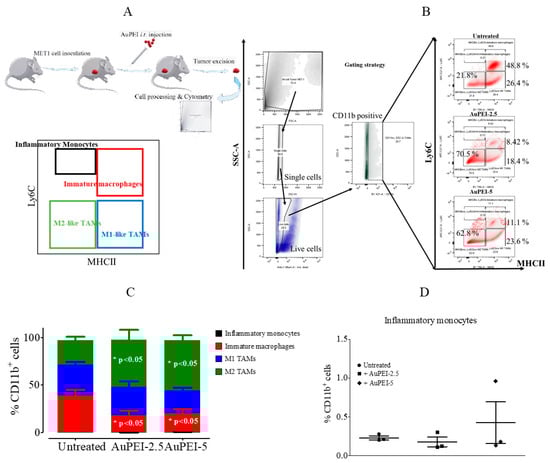 MET-1-infiltrating tumor-associated macrophage (TAM) distribution upon AuPEI nanocomposite i.t. injection. MET-1-bearing mice were injected i.t. with 40 µL of 0.5 mg/mL AuPEI nanocomposites and euthanized 24 h after. (A) Experimental procedure and gating strategy to differentiate TAMs within the tumor cell population. Inflammatory monocytes defined as CD11b+ MHCII− Ly6Chi; immature macrophages defined as CD11b+ MHCIIhi Ly6Chi; M1-like tumor-associated macrophages defined as CD11b+ MHCIIhi Ly6C−; and M2-like tumor-associated macrophages defined as CD11b+ MHCII− Ly6C−. (B) A representative dot-plot shows the percentage of different TAM populations upon AuNP nanocomposite injection and (C) summary of TAM distribution. (D) Distribution of inflammatory monocytes within tumor nest. (Results are shown as mean ± SEM of n = 3 per condition; * p < 0.05 Mann–Whitney test, 95% confidence).