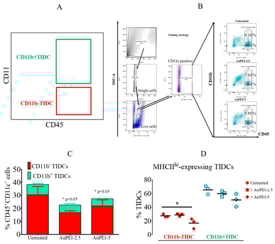 Among all myeloid cells, dendritic cells (DCs) are the most potent at inducing an efficient adaptive immune response as these cells process and present foreign antigens, e.g., tumor-associated antigens, to lymphocytes (B and T cells) in the context of MHC. Therefore, the presence of DCs in a TME is imperative for a proper anti-tumor immune response [59]. Dendritic cells normally represent a small fraction (1–5%) of the myeloid infiltrate in non-lymphoid tissues [60], and, although CD11c has been recently associated with a fraction of macrophages [61], CD11c remains still a bona fide DC marker. We thus analyzed the effect of AuPEI nanocomposites on tumor-infiltrating dendritic cells (TIDCs) based on the CD11c+CD45+ phenotype, which, according to the gating strategy, merely represents 4.44% of the whole cell population in untreated tumors. In untreated tumors, the CD11c+CD45+ CD11bhi subset merely represents 0.79% of the whole cell infiltrate, indicating that the incidence of CD11b in the prior analysis of CD11b+ monocyte/macrophage gating is negligible. However, among the TIDC population, the CD11bhi subset is often associated with poor tumor progression prognosis [62,63] or tolerogenic scenarios [64] and can have a great influence on the behavior of TIDCs (Figure 4A). Noteworthy, AuPEI nanocomposites lowered the proportion of both CD11b−/low- and CD11bhi-TIDC subsets (Figure 4B,C). Moreover, AuPEI-5 nanocomposites appeared to decrease the proportion of MHCIIhi-expressing cells within the CD11b− and CD11b+ TIDC subsets (Figure 4D).