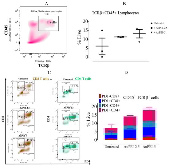 Since we observed a profound impact on MET-1 tumor-infiltrating myeloid cell populations upon AuPEI nanocomposite treatment in vivo, we sought to determine whether this phenomenon concurs with a change in tumor-infiltrating lymphocyte (TIL) subsets (Figure 5A). T cell subsets are perfectly distinguished by the co-expression of the receptor-type protein tyrosine phosphatase, CD45 [65], and the β chain of the T-cell receptor, TCRβ [66]. Both markers are among the most abundant proteins within the T-cell plasma membrane and are required for T-cell receptor signaling. Gating on live cells, we indeed noticed a trend in TIL (TCRβ+CD45+) percentage increase in all cases; TIL percentages varied from 6.17 ± 7.8% up to 11.33 ± 0.20% (AuPEI-2.5) and 13.11 ± 4.06% (AuPEI-5) (Figure 5B). Nonetheless, this increase in TIL was not homogeneous as the ratio of CD4/CD8 also increased from ~1 (untreated) up to 1.26 (AuPEI-2.5) and 1.34 (AuPEI-5).