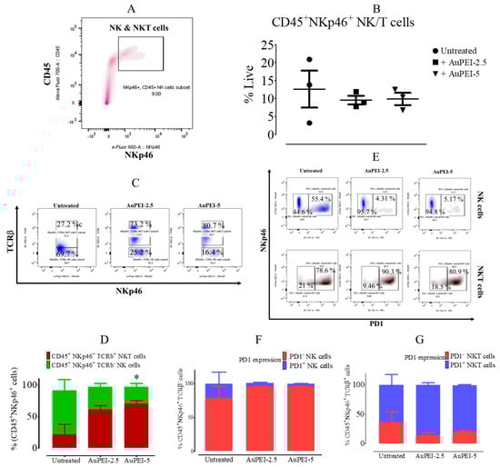 MET-1 tumor-infiltrating NK cell distribution upon AuPEI nanocomposite i.t. injection. MET-1-bearing mice were injected i.t. with 0.5 mg/mL Au (40 µL) AuPEI nanocomposites and euthanized 24 h after. (A) Gating strategy to differentiate NK/NKT cells within the tumor cell population. NK/NKT cells, CD45+NKp46+; NK, CD45+NKp46+TCRβ−; and NKT cells, CD45+NKp46+TCRβ+. (B) Percentage of total NK/NKT cell population in tumors. (C) Representative dot-plot and (D) summary of NK and NKT cell distribution within the total NK/NKT cell population. (E) Representative dot-plots show PD-1 expression by NK cells (upper) and NKT cells (lower); and a summary of PD-1 expression by (F) NK cells and (G) NKT cells. (Results are shown as mean ± SEM of n = 3 per condition; * p < 0.05 Mann–Whitney test, 95% confidence).