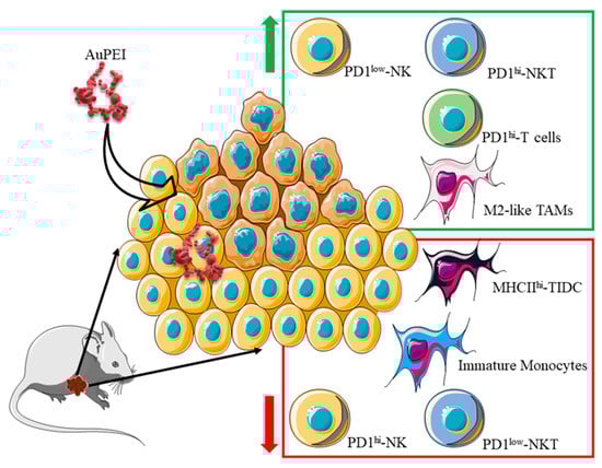 Unlike the T-cell compartment, PD-1 has a diverse behavior between NK and NKT cells. That is, the PD-1+ NK cell subset decreased in proportion to PD-1− NK cells (Figure 6E upper and Figure 6F) while in the NKT subpopulation occurred the opposite balance shift (Figure 6E lower and Figure 6G). We can then summarize the collective effect of AuPEI nanocomposites on reprogramming murine mammary tumor MET-1 microenvironment for infiltrating immune cells as shown in Scheme 1. As such, AuPEI seem to induce a heavy infiltration of T cells that exhibit a rather exhausted phenotype (PD-1+) and increment in the proportion of the anti-inflammatory M2-like macrophages.