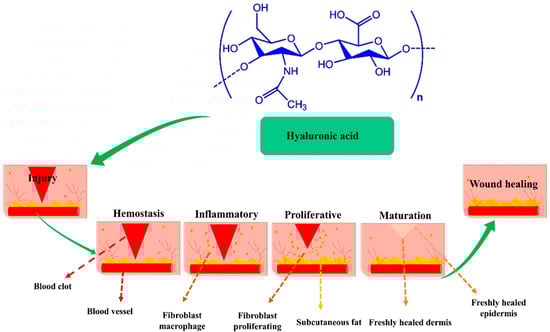HA is a linear glycosaminoglycan (GAG) present in all living creatures including bacteria and has a consistent chemical structure. Alternating repeating units of D-glucuronic acid and N-acetyl-D-glucosamine are connected by β-1, 4, and β-1, 3-glycosidic associations in biopolymeric HA [25]. HA is a constituent of dermal extracellular matrix (ECM), and is present in numerous tissues, including synovial fluid and soft and connective tissues [26,27]. HA has a rapid turnover rate in vivo and is catabolized in the extracellular environment via two pathways: (a) by hyaluronidase hydrolysis or by oxygen-free radical fragmentation before being evacuated from the lymphatic system, and (b) by enzymatic degradation initiated by adjacent cells, after which it is transported to lysosomes or endosomes [28]. The biological function of HA is reliant on molecular weight (MW) [29,30]. Specifically, HA receptors, such as CD44 (cluster of differentiation 44), RHAMM (receptor for HA-mediated motility), and TLR2 and 4 (toll-like receptors 2 and 4), interact with HA of different molecular weights [31], and these interactions regulate wound healing through several intracellular signaling pathways, though wound healing usually proceeds via the four sequential stages shown in Figure 1.