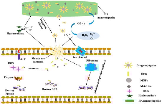 The mechanism underlying the antibacterial activity of HA nanocomposites is shown in Figure 2. The main steps are as follows: (a) Gram-positive bacteria and Gram-negative bacteria released hyaluronidase (HAase), which causes specific cleaved of the HA-Ag-drug nanocarrier [53,54]. Furthermore, metabolic activities of the antibacterial agent cause an acidic environment (H+) in the vicinity of bacteria [55]. Both HAase and H+ may cause MNPs and drugs released from HA composite. (b) MNPs have been shown to adhere and accumulate on cell membranes, where they may oxidize plasma membrane surface proteins and cause structural alterations in cell membranes [56]. (c) However, the M+ produced by MNPs dissolves cell membranes and causes considerable increases in membrane permeability and morphological changes [53,57]. (d) MNPs and M+ have also been shown to produce ROS, which can cause cell membrane damage [58]. (e) Membrane leakage can reduce the transmembrane proton electrochemical gradient and disable energy-dependent processes, such as adenosine triphosphate (ATP) production, ion transport, and metabolite sequestration [59]. (f) MNPs can easily enter bacterial cells by enhancing cell membrane permeability and then biochemically attach to ribosome at h44 in the 30S and H69 in the 50S subunit and prevent protein formation [60]. (g) Damaged DNA caused by MNPs can interact with intracellular enzymes and disrupt cellular metabolism-induced intracellular ROS production [54,61,62]. (h) Furthermore, interactions between MNPs and antibiotics produce MNPs-antibiotic complexes, which stimulate M+ ion release at cell walls and inhibit bacterial growth [63]. A synergistic antibacterial mechanism in which MNPs-antibiotic complexes increased ROS levels, membrane damage, and K+ leakage as a result of protein release and biofilm inhibition [64].