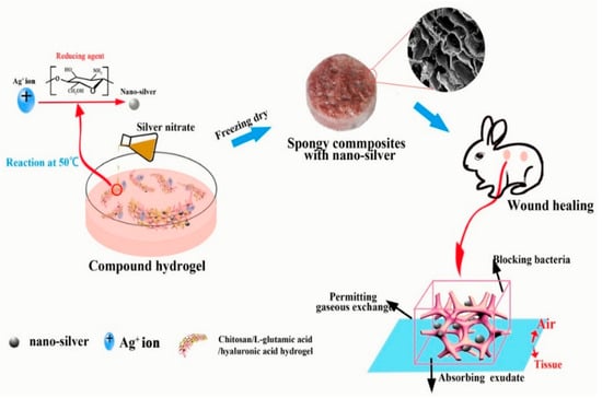 - Lu, B.; Lu, F.; Zou, Y.; Liu, J.; Rong, B.; Li, Z.; Lan, G. In situ reduction of silver nanoparticles by chitosan-l-glutamic acid/hyaluronic acid: Enhancing antimicrobial and wound-healing activity. Carbohydr. Polym. 2017, 173, 556–565. [Google Scholar] [CrossRef]