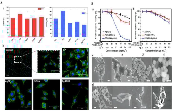 A(a) Cytotoxicity of at 24 and 72 h A(b) L929 Cell morphologies control and thermosensitive hydrogels for 1 day. DAPI stained nuclei (blue) and actin filaments stained with phalloidin−TRIC (green). Copyright 2019, Elsevier [71]. B(a) MRSA strain and B(b) drug resistance survival rates against E. coli under UV-light irradiation. SEM images for (c) MRSA and (d) drug resistance for E. coli after various treatments under UV-light irradiation (1) PBS (2) AgNO3 (3) PCN−224−HA and (4) PCN-224−Ag−HA. Copyright 2019, John Wiley and Sons [75].