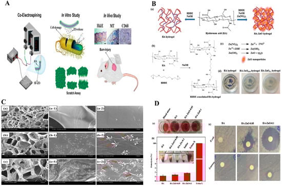 (A) Preparation of antibacterial HA-SF/ZnO fibers with core-shell structure and applied for wound healing. Copy right 2020, John Wiley and Sons [106]. (B) Formation of HA and HA-ZnO hydrogels, (C). SEM images ZnO hydrogels. (D). Hemolysis and antibacterial activity of hydrogels Figure (B–D) Copyright 2019, Elsevier [113]. (B) HA and HA-ZnO hydrogels B(a) formation of mechanism B(b) BDDE crosslinked hydrogels, B(c) ZnO nanoparticles, and (d) digital photographic hydrogels. (C) SEM images of C(a–a-2) HA, C(b–b-2) HA-ZnO-0.05, C(c–c-2) HA-ZnO-0.1. (D) Hydrogels treated with pig whole blood, D(a) photographic images of blood clot formed, D(b) hemolysis (%) of different hydrogels (inset photographic images showing hemolysis), D(c) antibacterial activity of hydrogels against E. coli and S. aureus