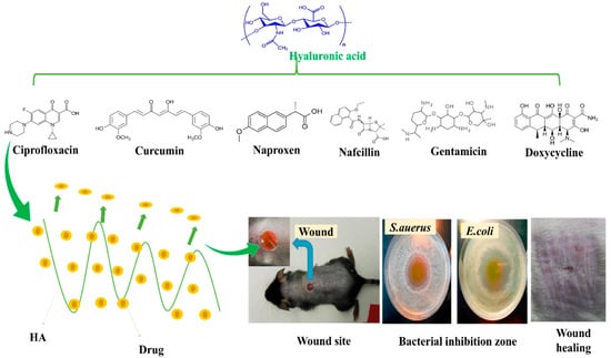 HA combined with different drugs; release at wound sites, bacteria mortality, and skin regeneration. Copyright 2017, Elsevier [116].