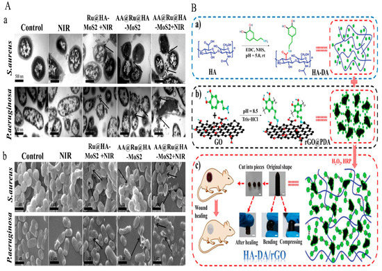 (A) TEM and SEM images of MDR bacteria treated with HA-nanosystem. Copy right 2019, American Chemical Society [123]. (B) (a) Preparation of the HA-DA/rGO hydrogel (b) HA-DA polymer formation for rGO@PDA, (c) HA-DA/rGO self-healable hydrogel applied in wound healing applications. Copy right 2019, John Wiley and Sons [124]. (A) TEM (a) and SEM (b) images of MDR bacteria treated with NIR, Ru@HA-MoS2 + NIR, AA@Ru@HA-MoS2, and AA@Ru@HA-MoS2 + NIR for 2 h respectively [123].