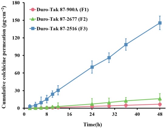 The selection of PSAs is the primary and critical step in the TDDs formulation design []. The differences in the solubility of the drug in PSAs and the nature of the PSA itself (e.g., structure, intrinsic thermodynamic activity, and drug–PSA interaction) affect the permeation flux [,]. Maximum thermodynamic activity is obtained when the drug is at its highest solubility level, allowing for the greatest permeation flux [,]. Therefore, to select the appropriate PSA, DIA patches with the highest solubility of COL were designed to evaluate the effect of different properties of PSA on skin permeability of COL. The transdermal permeation curves of COL for the three PSAs are shown in Figure 1, and the formulation composition and permeation parameters are listed in Table 2.