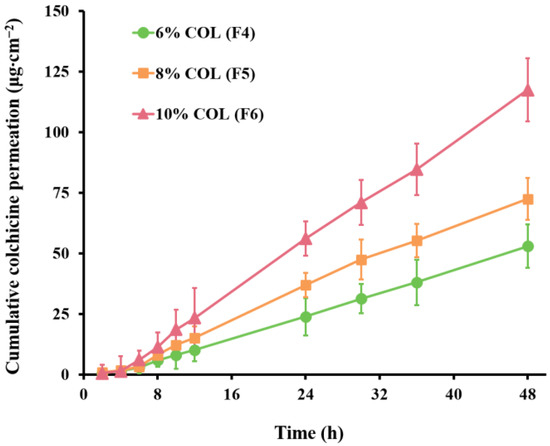 In vitro pig skin permeation profiles of colchicine (COL) from patches containing different contents of COL (w/w%, based on PSAs dry weight) in Duro-Tak 87-2516 (mean ± SD, n = 6).