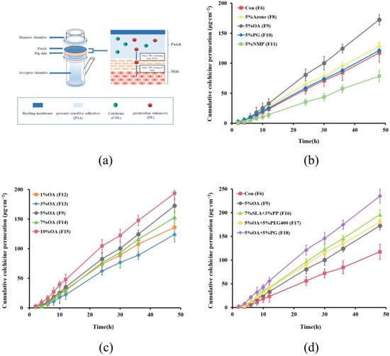 Multiple strategies have been developed to improve transdermal drug penetration by overcoming the intrinsic barrier of the stratum corneum []. The use of chemical permeation enhancers (CPEs) is the preferred and most commonly used approach. The mechanism by which CPEs enhance drug permeation relies on their influence on skin barrier structure and formulation properties [,]. In this study, the effect of permeation enhancers on the skin permeability of COL was assessed by preparing DT 2516-based patches containing different types and concentrations of single enhancers (AZ, OA, PG, and NMP) and binary permeation promoters (SLA+PP, OA+PEG 400, and OA+PG). The concentration of COL was set to 10% (w/w%) based on the percentage of the dry weight of PSA. Figure 3 shows the permeation profiles of COL in different patches. The corresponding formulation compositions and relevant permeation parameters are listed in Table 4.