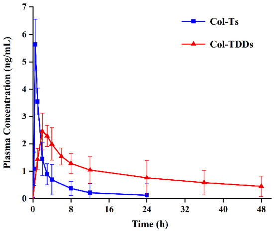 The final optimized COL-DIA patches from in vitro studies were applied to rat dorsal skin to determine the pharmacokinetic profile of transdermally administered COL-DIA patches compared with orally administered COL. A total of 12 healthy Sprague–Dawley male rats (240–260 g) were randomly divided into two groups (6 rats/group): COL-Ts (oral tablet group) and COL-TDDs (transdermal patch group). For 12 h before the experiment, rats in the COL-Ts group were fasted but allowed to drink water freely, and rats in the COL-TDDs group had dorsal hair removed using an animal razor, while the skin was carefully examined for any scratches or damage.