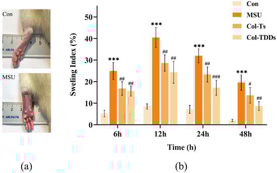 MSU crystals, the causative agent of gout, are a potent pro-inflammatory stimulus. Phagocytosis of MSU crystals stimulates macrophages residing in the joints, triggering the release of many inflammatory factors, such as IL-1β and TNF-α, and the infiltration of large numbers of neutrophils into inflamed joints [,]. The present study examined the effect of COL-DIA patches on the degree of joint swelling in rats with MSU-induced gout. Compared with the Con group, the left ankle joints of the rats in the MSU group exhibited severe redness and swelling after the injection of the MSU solution, with the maximum swelling occurring after 12 h (Figure 5a). Subsequently, the redness and swelling of rat joints in all groups gradually improved. Figure 5b shows the joint swelling index of each group at different time points. At each time point, the ankle swelling index was significantly higher in the MSU group than in the Con group. Meanwhile, rats in the Col-Ts and Col-TDDs groups showed significant inhibition of MSU-induced ankle swelling following drug intervention.