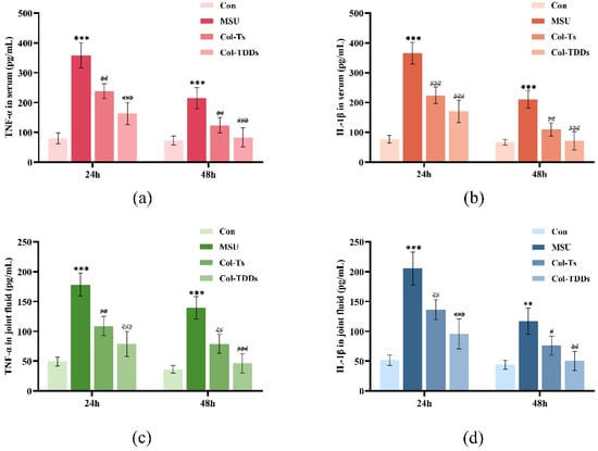 Next, the effects of the COL-DIA patch on the TNF-α and IL-1β levels in rat serum and joint fluid were examined. The ELISA results (Figure 6) showed that the expression of IL-1β and TNF-α in both serum and joint fluid were significantly upregulated after MSU injection. At 24 h, the expression of inflammatory factors was upregulated 3- to 5-fold in the MSU group compared with the Con group, indicating intense inflammation. Compared to the MSU group, the expression of inflammatory factors was substantially decreased in the Col-Ts and Col-TDDs groups, probably because of the powerful anti-inflammatory activity of COL, which could block the release of IL-1β and TNF-α by inhibiting the activation of NLRP3 inflammasome and Caspase 1. Although the expression levels of these inflammatory factors induced by MSU were gradually suppressed by autoimmunity over time, especially 48 h after modeling, there were still significant differences in the expression levels of IL-1β and TNF-α between the model and treatment groups. Notably, the Col-TDDs group exhibited a higher inhibition of inflammation than the Col-Ts group. This could be attributed to the direct action of the COL-DIA patch on the lesion and the sustained and slow release of the drug from the patch.