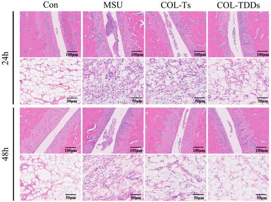 Finally, the effect of COL-DIA patches on MSU crystal-induced ankle histological manifestations was examined. A large number of neutrophils infiltrating inflamed joints is the main feature of acute gouty arthritis. As shown in Figure 7, the ankle joints of rats in the Con group were normal and there was no significant inflammatory infiltration. In contrast, the rats in the MSU group showed thickened articular cartilage and a lot of inflammatory cells infiltrating the narrow articular cavity. Symptoms improved 48 h after MSU injection, but notable inflammatory cell infiltration was still observed in the MSU group rats. Compared to the MSU group, the pathological damage in the ankle joint of experimental rats treated with COL was significantly attenuated, presumably because COL could inhibit the contact between MSU crystals and monocytes and inhibit leukocyte accumulation in the ankle joint. Notably, the inflammatory condition of rats in the COL-TDDs group showed a more significant improvement compared to the Col-Ts group, which may due to the relatively long MRT of COL-DIA patches and the ability to act directly on the lesion site.