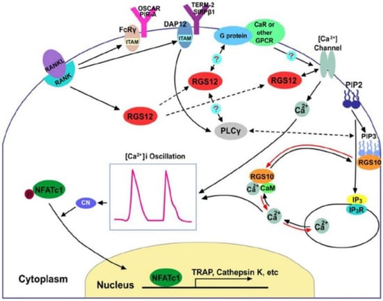 Osteoclasts, derived from mononuclear hematopoietic myeloid lineage cells, are multinucleated cells that degrade bone matrix. The mechanism of regulating osteoclast formation and their functions are complex, while calcium is one important signal for osteoclast motility downstream of tyrosine kinase signals. There is growing recognition that regulators of G-protein signaling play important roles in regulating calcium oscillations and thus osteoclast differentiation. More than 30 RGS proteins have been found at present, among which RGS10, the smallest protein in the RGS family [17], and RGS12, the largest protein in the RGS family [18], were prominently expressed in osteoclasts. Numerous studies have indicated that both RGS10 and RGS12 play roles in regulating calcium oscillations and osteoclast differentiation through RANKL-evoked calcium oscillation-nuclear factor of activated T cells (NFAT) c1 signaling pathway (Figure 2) [19]. In addition, Yuan et al. have found that the deletion of RGS12 inhibits osteoclastogenesis, as well as the expression of inflammatory cytokines and macrophages migration in response to the stimulation of lipopolysaccharide (LPS), which demonstrates that the restraint of RGS12 in macrophages is a potential therapeutic target for preventing bone loss in periodontitis treatment [20].