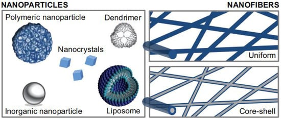 Numerous novel nano-DDSs have been designed for periodontitis treatment for advantaged characteristics, such as pharmacodynamics, bioavailability, and cell-specific targeting [40]. The selection of appropriate nano-DDSs for specific substances should be in harmony with the physiology of the deteriorated tissue and the pharmacology of the agents needed. For example, liposomes, dendrimers, or hydrogels, can provide a sustained, controlled release in the damage site for proteins or polypeptides. In addition, it will be advantageous if the selected drugs or drug delivery systems can be easily modified according to the desired properties of the targeting site [41]. The following section describes two main forms of nano-DDSs that have been researched sufficiently for periodontal tissue regeneration [42]: nanoparticles and nanofibers (Figure 4).