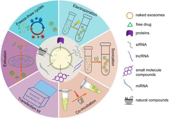 The post-secretory approach refers to the way that naive exosomes are extracted and isolated from donor cells, and then the purified exosomes are loaded with drugs by various methods in vitro. Some common approaches include co-incubation, electroporation, sonication, repeated freeze-thawing, extrusion, and so on (Figure 3).