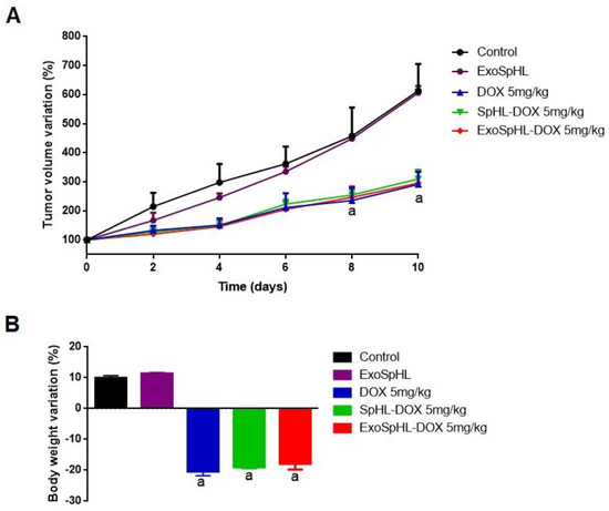 | ExoSpHL-DOX 5 mg/kg | 2.7 ± 0.4 a | 55.7 |