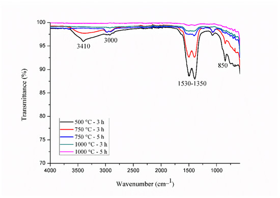 For comparison purposes, Gd2O3:Eu3+ nanoparticles calcined at different temperatures and durations were also studied with IR spectroscopy (Figure 2). The band corresponding to the water molecules is observed at 3410 cm−1. Absorption bands associated with carbonate anions formed during the calcination process within the region of 1500–1390 cm−1 and at 847 cm−1 are observed [40]. Two bands near 3000 cm−1 are characteristic bands for C-H, or more specifically, from the stretching of CH2 groups and asymmetric stretching of CH3 groups, confirming the presence of organic groups [43,45,46]. Therefore, the decrease in the intensity of all these bands and their consequent disappearances as the calcination temperature and time increased leads to the conclusion that water and organic materials were eliminated during thermal treatment at 1000 °C for 5 h.