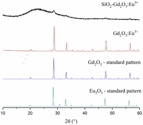 As seen in the standard spectra (Figure 4), the diffractograms for the Gd3+ and Eu3+ oxides are hardly distinguishable due to their identical cubic space groups and lattice configurations and their similar lattice parameters (1.0808 nm for Gd2O3 and 1.0866 nm for Eu2O3), which is quite expected. However, the XRD results confirmed the formation of the crystalline phase of Gd2O3:Eu3+.