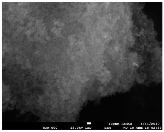 The scanning electron microscopy (SEM) images of Gd2O3:Eu3+ show aggregates of uniformly distributed primary nanoparticles possessing an isotropic shape with a mean size of approximately 100 nm (Figure 5). Silica-supported Gd2O3:Eu3+ nanoparticles show a smaller size and homogeneous distribution with an agglomeration of these nanoparticles, as can be seen in Figure 6a,b. We show SEM images of one concentration, SiO2-Gd2O3:Eu3+(1%), and the results of the other two samples (at 3 and 5% Eu3+) are in the Supplementary data (Figure S1).