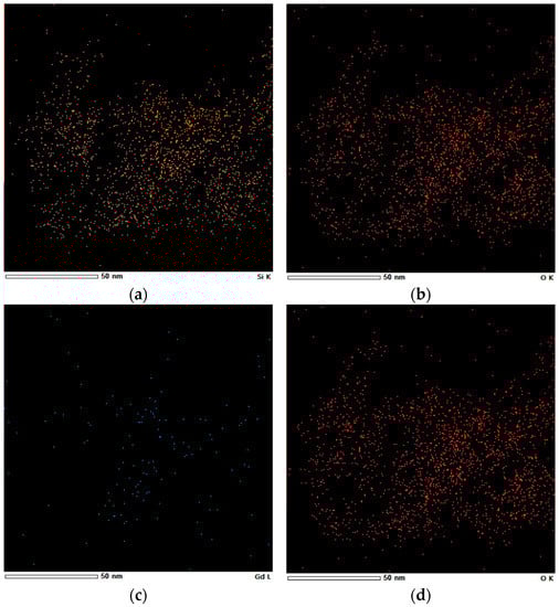 The elements in SiO2-Gd2O3:Eu3+(1%) nanoparticles were also mapped by X-ray energy dispersion spectroscopy (EDS) elemental mapping (Figure 7) to detect the Gd and Eu distributed congruently on silica, despite the low intensities of their signals. Notably, O and Si are the most visible elements. These elements are homogeneously distributed in the nanosilica matrix.