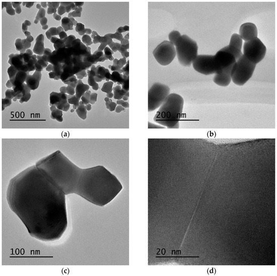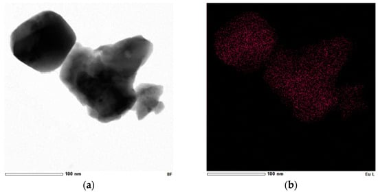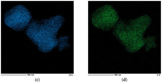 Regarding Gd2O3:Eu3+, the TEM images of the nanoparticles demonstrate that despite being aggregated, they have a homogeneous distribution with an average diameter of ~100 nm (Figure 8a,b), which is consistent with the SEM results shown above. The clear grain boundaries inside the aggregates indicate a distinct delimitation between the Gd2O3 crystallites (Figure 8c,d). Additionally, the EDS results confirm the presence of Eu and Gd in the sample, and the elemental mapping results also reveal that Eu is homogeneously incorporated into the Gd2O3 nanoparticles (Figure 9).