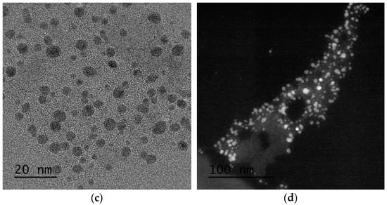 Regarding SiO2-Gd2O3:Eu3+(1%) nanoparticles, one can discern the amorphous phase of silica at a larger particle size, and the rare earth metal oxide is essentially smaller than the respective support (Figure 10a,b). The crystallinity of the rare metal oxide and overall morphology of the sample are shown by different TEM and scanning transmission electron microscopy (STEM) images in the Supplementary data (Figures S2–S4). To support this observation, bright-field and high-angle annular dark-field images (HAADF) in STEM mode were obtained (Figure 10c,d). The HAADF image has atomic number contrast and hence clearly shows that the brighter oxide nanoparticles in Figure 10d contain much heavier atoms (Gd and Eu) than the matrix.