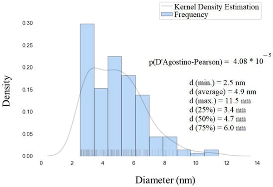 The size distribution of gadolinium oxide nanoparticles over nanosilica was assessed and plotted through a histogram with a basic statistical analysis (Figure 11). From this figure, we can observe that most of the nanoparticles are in the range of 2–7 nm, which is much smaller than the Gd2O3:Eu3+ sample.