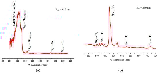 In the emission spectrum, well-defined characteristic emission bands of Eu3+ are observed (Figure 12b). All transitions start from the 5D0 state since other excited state transitions, such as 5D1, 5D2, and 5D3, are much less common. These characteristic bands refer to the 5D0 → 7FJ transitions (J = 0 to 4) of Eu3+; more specifically, to the 5D0 → 7F0 (580 nm), 5D0 → 7F1 (591 nm), 5D0 → 7F2 (610 nm), 5D0 → 7F3 (649 nm), and 5D0 → 7F4 (707 nm) transitions. The 5D0 → 7F5 and 5D0 → 7F6 transitions are not observed since they appear in the IR region and the intensities of these transitions are very low [23,50].