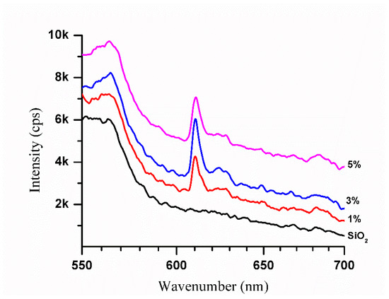 The photoluminescence emission spectra of SiO2-Gd2O3:Eu3+(1%) nanoparticles were recorded in a spectral range from 550 nm to 720 nm, with excitation at a wavelength of 260 nm (Figure 13).