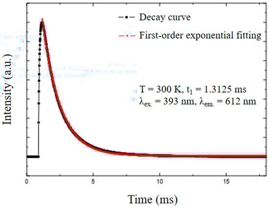 The photoluminescence decay was measured (Figure 14) to calculate the lifetime of the Gd2O3:Eu3+ nanoparticles. The lifetime of the excited Eu3+ level in the analyzed nanoparticles was t1 = 1.31 ms, which is similar to the reported values in the literature [41]. The first-order exponential decay proves the homogeneity and purity of the material.