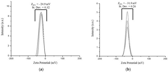 ζ-potential diagram measured in triplicate for the (a) Gd2O3:Eu3+ and (b) SiO2-Gd2O3:Eu3+(1%) nanoparticles, in which negative potential values are found for both samples.