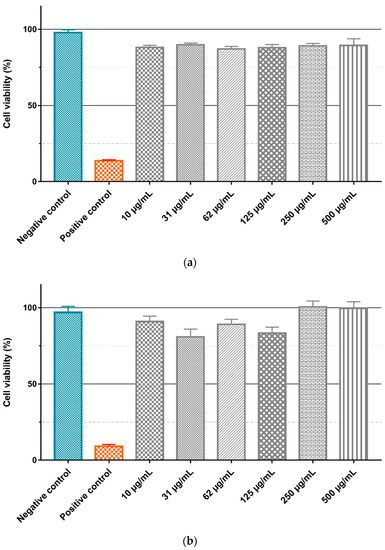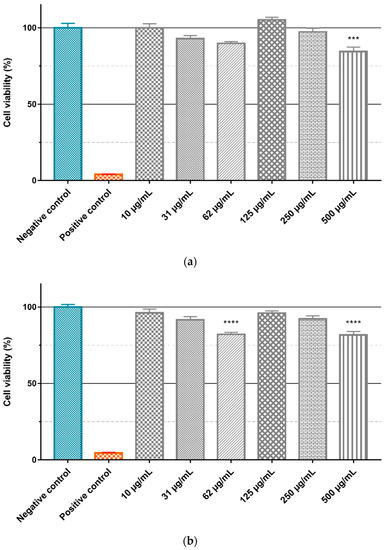 To evaluate the intrinsic cytotoxicity of the Gd2O3:Eu3+ and SiO2-Gd2O3:Eu3+(1%) nanoparticles, the GL261 cell line was treated with different concentrations (10, 31, 62, 125, 250, and 500 µg/mL) of the nanoparticles diluted in culture medium, and the cell viability was evaluated by the MTT assay (Figure 18). ANOVA with a Bonferroni posttest and a Kruskal–Wallis test with a Dunn posttest showed that there is no significant difference between the negative control and treatment with different concentrations of Gd2O3:Eu3+ (Figure 18a) and SiO2-Gd2O3:Eu3+(1%) (Figure 18b) nanoparticles. However, when testing the same nanoparticles in non-tumor cell lines (Figure 19), we observed a small but statistically significant reduction in viability with 500 µg/mL of Gd2O3:Eu3+ (Figure 19a) and with 62 and 500 µg/mL of SiO2-Gd2O3:Eu3+(1%) (Figure 19b).
