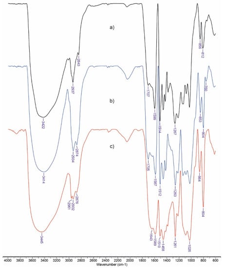 Figure 1. FTIR spectra of LIG (a), Lep (b), and LCD (c).