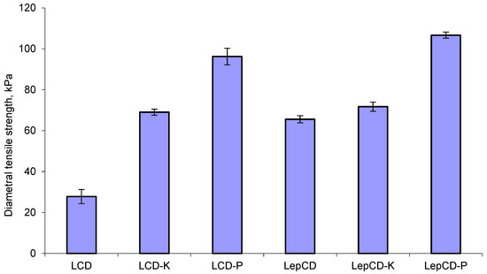 The specimens were removed from the molds and incubated for 1 day at 37 °C with 100% humidity. Shimadzu, Kyoto, Japan’s EZ-Test equipment was used for the diametral tensile strength (DTS) testing, with a loading rate of 0.5 mm per minute. Equation (1) was used to obtain the DTS value:
