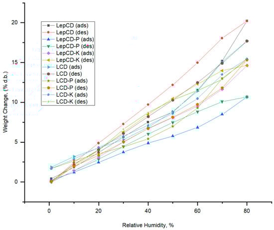 An IGAsorp device (Hidden Analytical, Warrington, UK) was used to assess the water sorption at atmospheric pressure. The investigations had an accuracy of 1% for 0–90% RH and 2% for 90–95% RH, and they were conducted at humidity levels between 0 and 95%, in a temperature range between 5 °C and 85 °C.