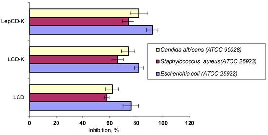Some authors [30,31] stipulated that groups containing oxygen in lignin impact, and presence of phenolic compounds improve, the antibacterial performance by affecting its antioxidant activity. Therefore, a lower antimicrobial activity for material comprising lignin crosslinked by epichlorohydrin was expected. However, Rocca et al. [32] observed that the layer of bacterial cell walls consisting of peptidoglycan can interact with sugar molecules, which suggests that the sugar content of the lignin material may enhance the adherence to the bacterial membrane. This increased the antimicrobial activity. Our results evidenced a high antimicrobial activity for all materials. LepCD-K presented the highest activity against all studied pathogenic agents.