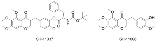 Ocular neovascularization is associated with diseases such as wet age-related macular degeneration, retinopathy of prematurity, and proliferative diabetic retinopathy, leading to blindness in severe cases [1,2,3]. Cremastranone is a member of the homoisoflavanone family of natural products that have anti-angiogenic activity in the eyes [4,5,6,7]. We have reported previously the design, synthesis, and biological evaluation of novel homoisoflavonoid analogues using cremastranone as primary scaffold in an effort to discover a potent and selective inhibitor of angiogenesis [8]. Our structure–activity relationship analysis showed that the incorporation of N-carbamate amino acids improved the anti-angiogenic activity in vitro and in vivo [8]. Our study also showed that SH-11037 (Figure 1) was the most potent and selective inhibitor of neovascularization among the synthesized homoisoflavonoids [8,9].