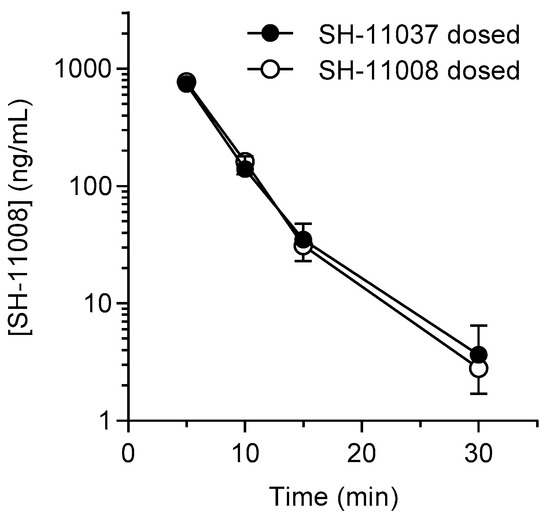 Plasma concentration–time curves of SH-11008 following a single i.v. dose of SH-11037 and SH-11008 in mice. Plasma samples were collected for 24 h following a single i.v. dose of SH-11037 (5 mg/kg) and SH-11008 (3 mg/kg, equimolar to 5 mg/kg SH-11037) in male ICR mice. SH-11037 was BQL throughout the time course. SH-11008 was BQL after 30 min post-dosing. Data are presented as mean ± standard deviation (S.D.) (n = 3).
