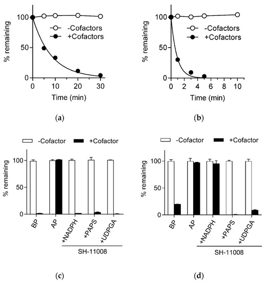 Metabolic stability of SH-11008 in MLS9 (a,c) and HLS9 (b,d) fractions. SH-11008 (1 µM) was incubated in triplicates at 37 °C in the liver S9 fractions (1 mg protein/mL) in the absence and presence of the cofactors (NADPH, PAPS, and UDPGA). The cofactors were added at 1 mM either as a mixture (a,b) or individually (c,d). Buspirone (BP) and antipyrine (AP) incubated in the presence of NADPH (c,d) were used as positive and negative control, respectively. The incubations in (c,d) were conducted for 30 min. Data are mean ± SD (n = 3).