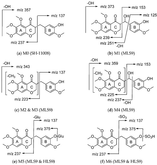 The [M + H]+ ion of SH-11008 was detected at m/z 375.1426 (Table 4). SH-11008 produced a fragment ion of m/z 357 after the loss of OH, and C-C bond cleavage between the B- and C-rings generated the fragment ions of m/z 237 and 137 (Figure 6a). The phase I metabolites (M1–M4) were detected in the MLS9 fractions following the incubation of SH-11008 in the presence of NADPH, but not in the HLS9 fractions (Figure 6b–d), consistent with the metabolic stability results described in Figure 5. The [M + H]+ ion of M1 was detected at m/z 391.1363 corresponding to a mono-oxygenated metabolite (i.e., +16 u from the parent) of SH-11008 (Table 4). M1 produced a fragment ion of m/z 373 after the loss of OH (Figure 6b). The fragment ions of M1 at m/z 153 (16 u higher than the fragment ion m/z 137 of SH-11008) and m/z 125 suggest that the oxygenation likely occurred on the carbon between the B- and C-rings (Figure 6b). The [M + H]+ ions were detected at m/z 361.1232 for M2 and at m/z 361.1290 for M3, corresponding to the mono-demethylated metabolites (i.e., −14 u from the parent) of SH-11008 (Table 4). M2 and M3 produced a fragment ion of m/z 343 after the loss of OH, and C-C bond cleavage between the B- and C-rings generated the fragment ions of m/z 223 and 137 (Figure 6c). The fragment ion at m/z 223 of M2 and M3, which was 14 u lower than the one at m/z 237 of SH-11008, indicates that the A-ring of M2 and M3 underwent loss of a methyl group (Figure 6c). M2 and M3 had the same mass but different retention times (Table 4). Unfortunately, since both metabolites share the same fragment ions, the exact metabolic position could not be specified (Table 4). The [M + H]+ ion of M4 was detected at m/z 377.1218 corresponding to a concurrent metabolite of mono-oxygenation and mono-demethylation (i.e., +2 u from the parent) of SH-11008 (Table 4). M4 produced a fragment ion of m/z 359 after the loss of OH (Figure 6d). M4 also had fragment ions at m/z 225 and 237, which was 14 u lower than the fragment ions of M1 observed at m/z 239 and 251, consistent with mono-demethylation (Figure 6d). The fragment ions at m/z 153 and 237 suggest that the mono-oxygenation of M4 occurred on the same position as M1 (Figure 6d). M5 and M6 were detected in both MLS9 and HLS9 fractions. The [M + H]+ ions were detected at m/z 551.1758 for M5 and at m/z 455.1015 for M6 corresponding to a mono-glucuronide conjugate (i.e., +176 u from the parent) and a mono-sulfate conjugate (i.e., +80 u from the parent) (Table 4). Fragmentation of M5 and M6 generated the [M + H]+ ion of SH-11008 (m/z 375) together with its fragment ions (m/z 237 and 137) (Figure 6e,f).