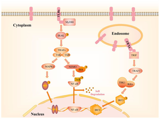TLRs consist of an extracellular leucine-rich repeat (LRR) recognition domain and an intracellular Toll/IL-1 receptor (TIR) domain that transmits downstream signals. Activation of TLRs proceeds by dimerization of TLRs to form TIR-TIR structures that recruit intracellular adaptor proteins that also contain TIR domains to activate NF-κB, p38 and JNK signaling transduction [13]. TLR-activated pathways include the MyD88-dependent pathway and the TRAF-dependent pathway. Upon TLR recognition of ligands, members of the TLRs family other than TLR3 recruit the adapters MyD88, Mal, IRAKs, or TRAFs, thereby initiating the MyD88-dependent pathway [14]. MyD88 recruits IL-1R-associated kinases (IRAKs) that are phosphorylated to bind to TRAF (tumor necrosis factor receptor-associated factor) which then interacts with the ubiquitin-conjugating enzymes and becomes polyubiquitinated. Activated TRAFs combine with TGF-β-activated kinase (TAK) and TAK1-binding protein (TAB) to phosphorylate IκB kinase (IKK). This activated IKK phosphorylates IκB, an inhibitor of NF-κB, and promotes its degradation, thereby activating NF-κB transcription factors and mitogen-activated protein kinases (MAPKs). Consequently, the nuclear translocation of NF-κB and AP-1 induces the production of inflammatory cytokines and activates the transcription of innate immune effector genes [15,16]. In the TRIF-dependent pathway, TLR3 signaling is completely dependent on the adaptor protein TIR domain-containing adaptor inducing IFN-β (TRIF), also named as Toll-IL-1 receptor (TIR) domain-containing adaptor molecule-1 (TICAM-1). TRIF consists of a proline-rich N-terminal region, a TIR domain and a C-terminal region. Among them, the TIR domain of TRIF interacts with the TIR domain of TLR3, and the N-terminal region is essential for further phosphorylation and activation of interferon regulatory factor 3 (IRF3) by recruiting TANK-binding kinase 1 (TBK1) and the inhibitor of nuclear factor κB kinase ε (IKKε, also known as IKK ε). Finally, IRF3 activation mediates the production of pro-inflammatory cytokines and type I interferon (IFN) [14] (Figure 1).