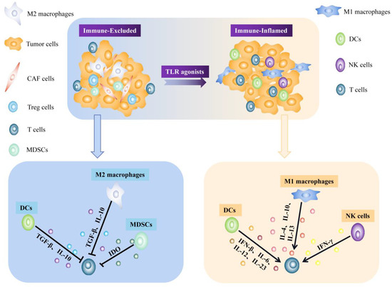 Reprogramming of the immunosuppressive TME by TLR agonists. Immune-Excluded (I-E) TIMEs are characterized by the exclusion of T cells from the tumor core, whereas MDSCs and Treg cells can suppress antitumor immune responses and promote malignant cell growth. And many cancers typically exhibit an immunosuppressive M2-like phenotype, in an anti-inflammatory state. TLR agonists treatment can transform the I-E TIME into an immune-inflamed (I-I) TIME. In the process of this transformation, TLRs activation is able to induce macrophage polarization toward the M1 type. And the cytokine profiles of dendritic cells (IL-6, IL-12, IFN-β and IL-23) and NK cells (IFN-γ) induced by individual TLR agonists enhance T-cell infiltration and alter the suppressive function of Treg cells.