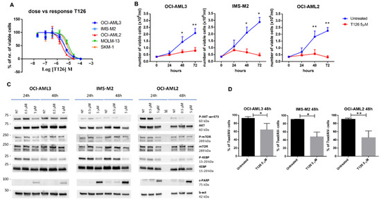 We then investigated the effect of T126 on OCI-AML3, IMS-M2, and OCI-AML2 cell growth (0–72 h), using a concentration of 5 µM, and found that T126 was able to induce a significant growth inhibition at 48 and 72 h in all the three of the AML cell lines (Figure 4B).