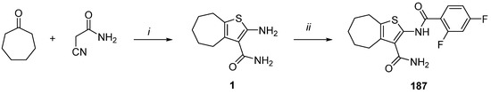 Compound T187 was synthesized as reported in Scheme 1, starting from a one-pot Gewald reaction entailing the reaction of cycloheptanone with cyanoacetamide in the presence of sulphur and morpholine in EtOH at reflux, to give the intermediate 1 [36]. Successive amidation of compound 1 [36] with 2,4-difluorobenzoic acid was performed in CH2Cl2 at 50 °C, in the presence of the Mukaiyama reagent (2-chloro-1-methylpyridinium iodide, CMPI), 4-dimethylaminopyridine (DMAP), and triethylamine (TEA), furnishing compound T187.