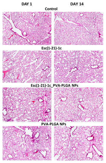 Histological analysis of lungs in CD1 mice, after 1 day and 14 days from i.t. administration of Esc(1-21)-1c either in the free or encapsulated form at a dosage of 1.5 mg/kg. The amount of unloaded PVA-PLGA NPs was the same as that present in Esc(1-21)-1c-loaded NPs. The results were compared to those obtained with PBS-treated mice (control), (magnification 4×).