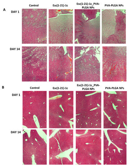 Representative images of kidney (A) and liver (B) tissues in CD1 mice, after 1 day and 14 days from i.t. administration of Esc(1-21)-1c either in the free or encapsulated form at a dosage of 1.5 mg/kg compared to the corresponding bare PVA-PLGA NPs or PBS-treated animals (control). Organs were harvested, fixed, and stained for histological evaluation (magnification 4×).