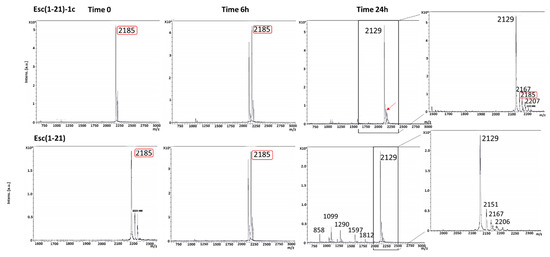 Mass spectra of Esc(1-21)-1c and the all-L Esc(1-21) after 6 and 24 h in BAL. Marked in red is the peak of molecular mass at 2185 corresponding to the full-length peptide. The arrow indicates the peak of molecular mass at 2185 found for Esc(1-21)-1c after 24 h of incubation with BAL.